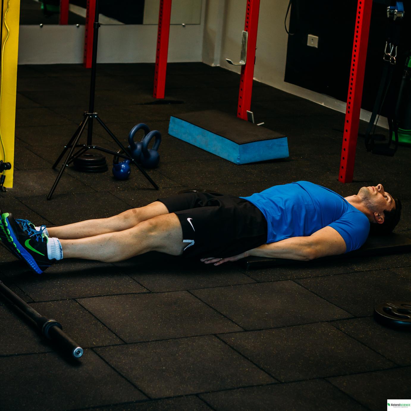 deitado(a) no chão de barriga para cima, braços estendidos ao lado do corpo com as palmas das mãos viradas para baixo